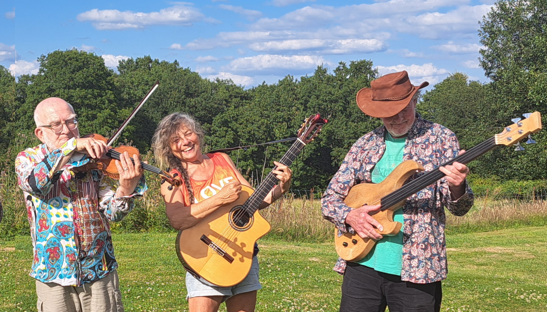 But for the short answer, here are the ingredients. Hot Club Gypsy swing, jigs'n'reels, traditional folk songs, and jazz of all flavours... on violin, Spanish guitar, and fretless bass. We sing too, with passionate voices in harmony.