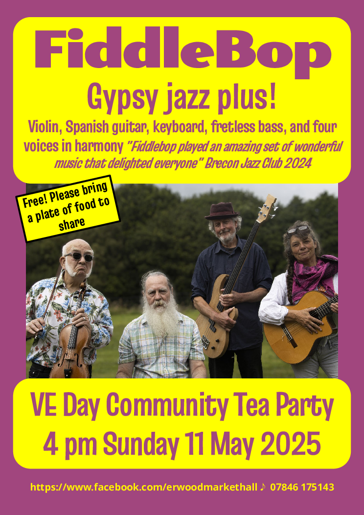 There's no rest for the wicked! The very next day (Sunday 11 May 2025) FiddleBop played in Erwood Market Hall (Erwood, Powys LD2 3EZ), for the community celebration of the 80th Anniversary of VE Day.