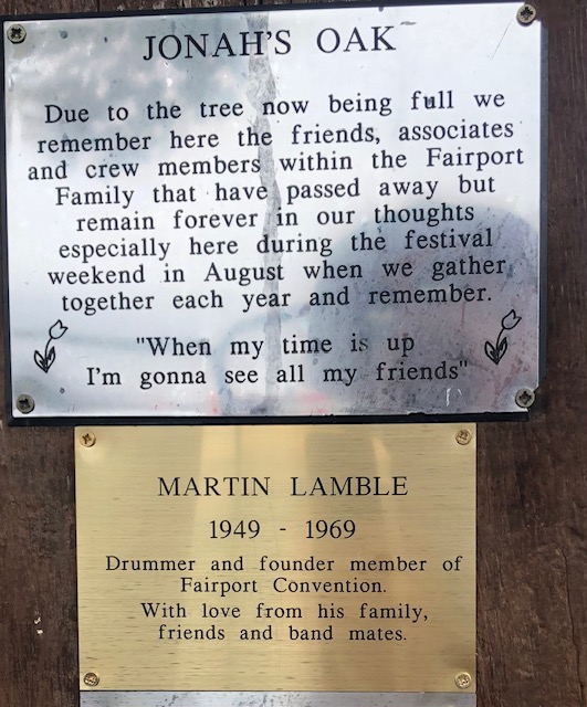 Here's a picture of the plaque. It is next to 'Jonah's Oak', a tree at the site of Fairport's annual Cropredy Festival. Jonah's Oak commemorates members of Fairport, and Fairport fans, who are no longer with us.